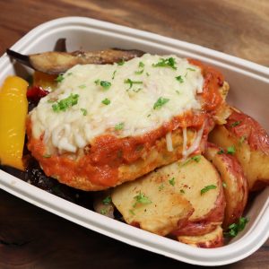 Chicken parmesan served with roasted mini potatoes and grilled vegetables. Packed individually in a recyclable container that can be heated in the microwave.$17.95 each -