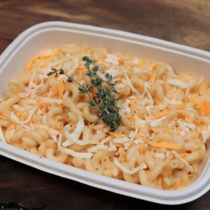 Macaroni with cheddar, parmesan and mozzarella cheeses. Packed individually in a recyclable container that can be heated in the microwave.$15.95 each -