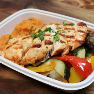 BBQ chicken breast, sweet potato mashed, and grilled vegetables. Packed individually in a recyclable container that can be heated in the microwave.$17.95 each -