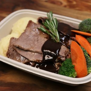 Beef brisket, gravy, garlic mashed, vegetable medley. Packed individually in a recyclable container that can be heated in the microwave.$17.95 each -