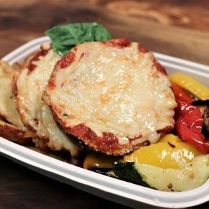 Eggplant Parmesan with roasted mini potato, grill vegetables. Packed individually in a recyclable container that can be heated in the microwave.$16.95 each