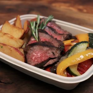 Grilled steak, mini roasted potatoes, and grilled veggies. Packed individually in a recyclable container that can be heated in the microwave.$19.95 each -