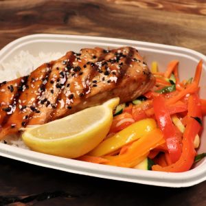 Salmon Teriyaki, basmati rice and Asian stir fried veggies. Packed individually in a recyclable container that can be heated in the microwave.$19.95 each -