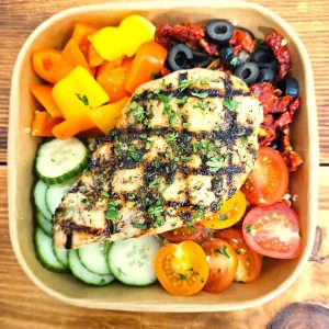 Grilled lemon herbed halal chicken on top of a Mediterranean quinoa salad with cherry tomatoes, cucumbers, bell peppers, sundried tomatoes and black olives$18.95 each -