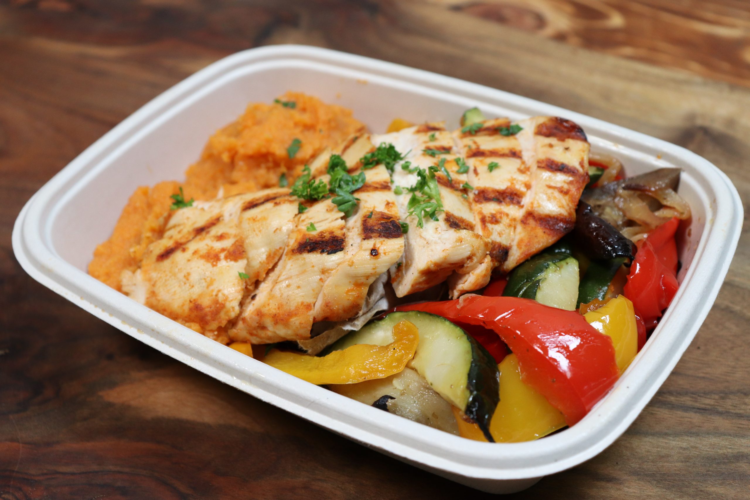 BBQ chicken breast, sweet potato mashed, and grilled vegetables. Packed individually in a recyclable container that can be heated in the microwave.