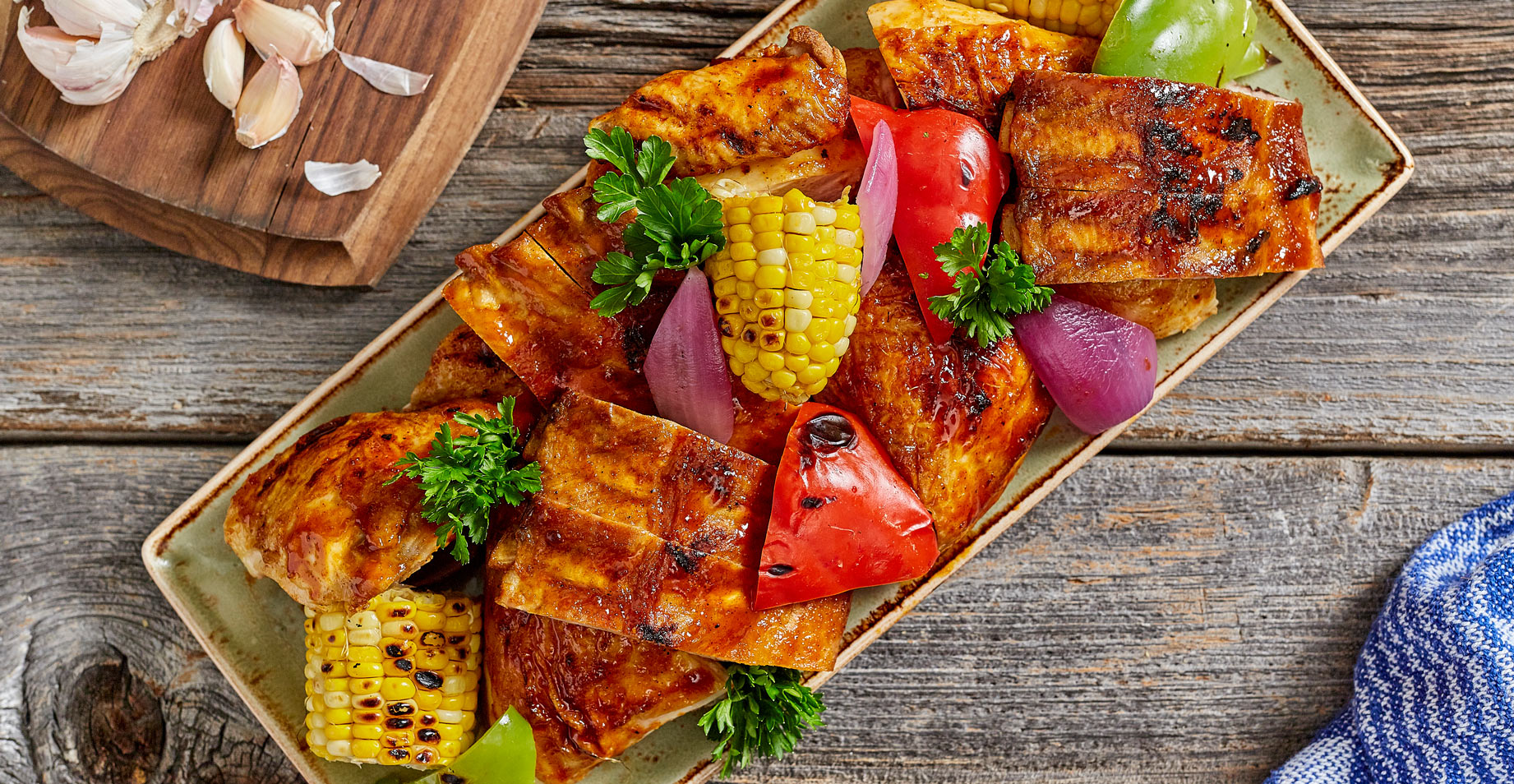 BBQ chicken and baby back ribs garnished with grilled peppers and cut corn on the cob. Served with your choice of Caesar or mixed green salad and one salad bar side option, and your choice of bread. Delivered cold (served at room temperature).
