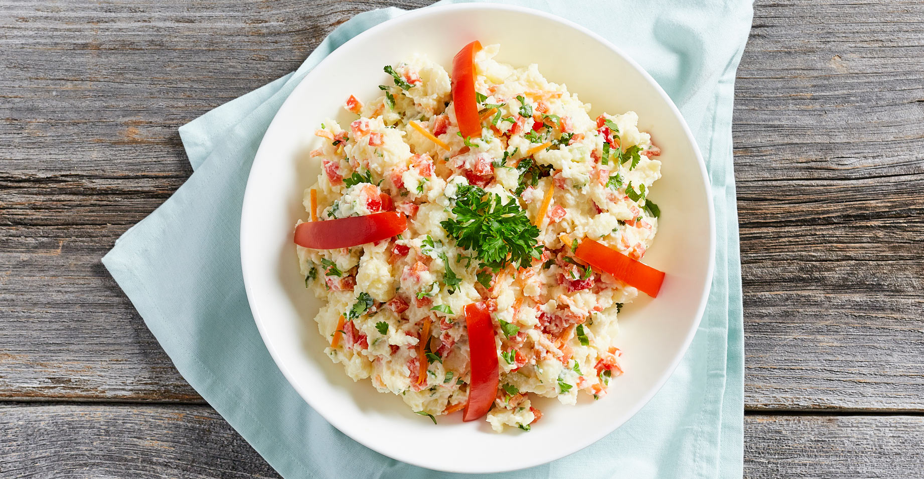 Potatoes, bell peppers, carrots, parsley, and egg, in a creamy mayo dressing.