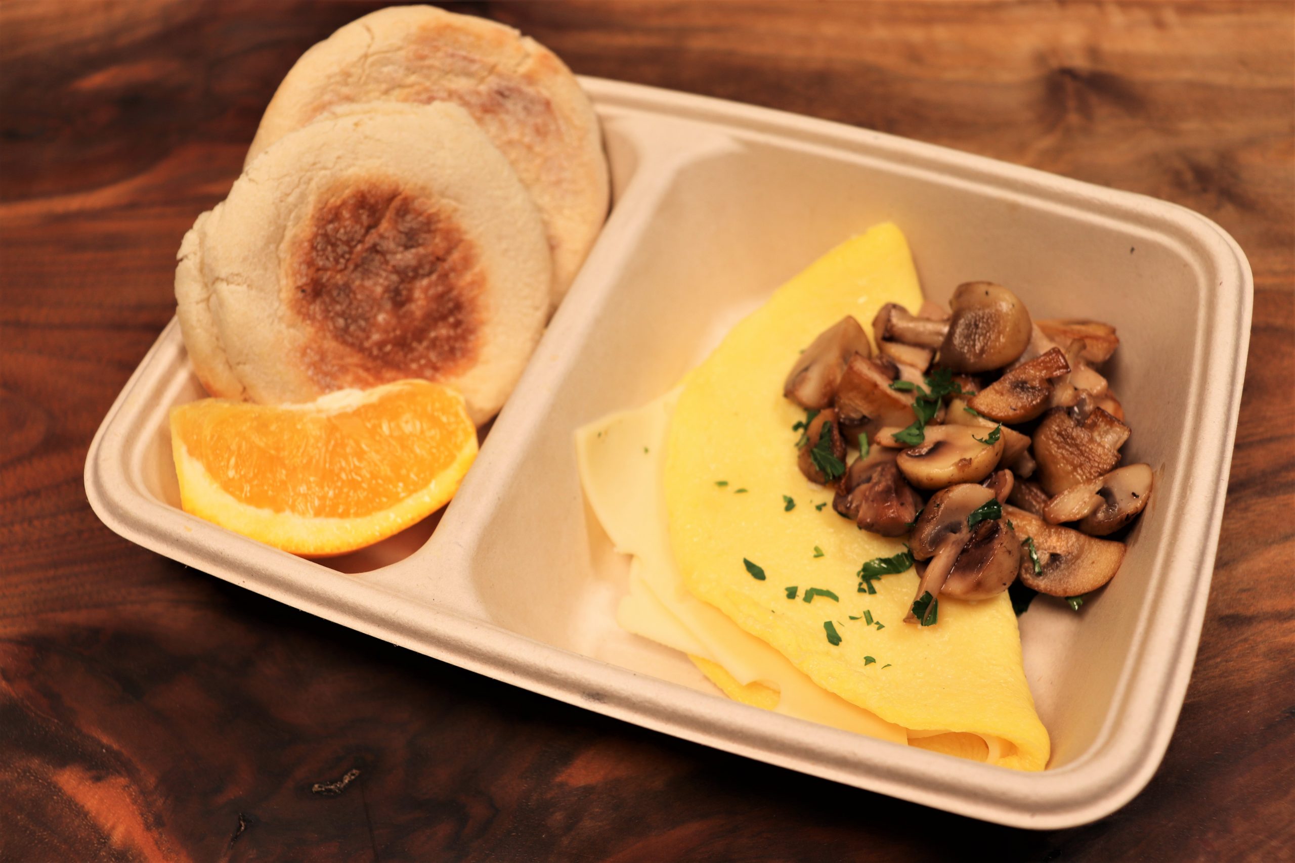 Mushroom and swiss cheese omelette, English muffin and orange wedge. Packed individually in a recyclable container that can be heated in the microwave.