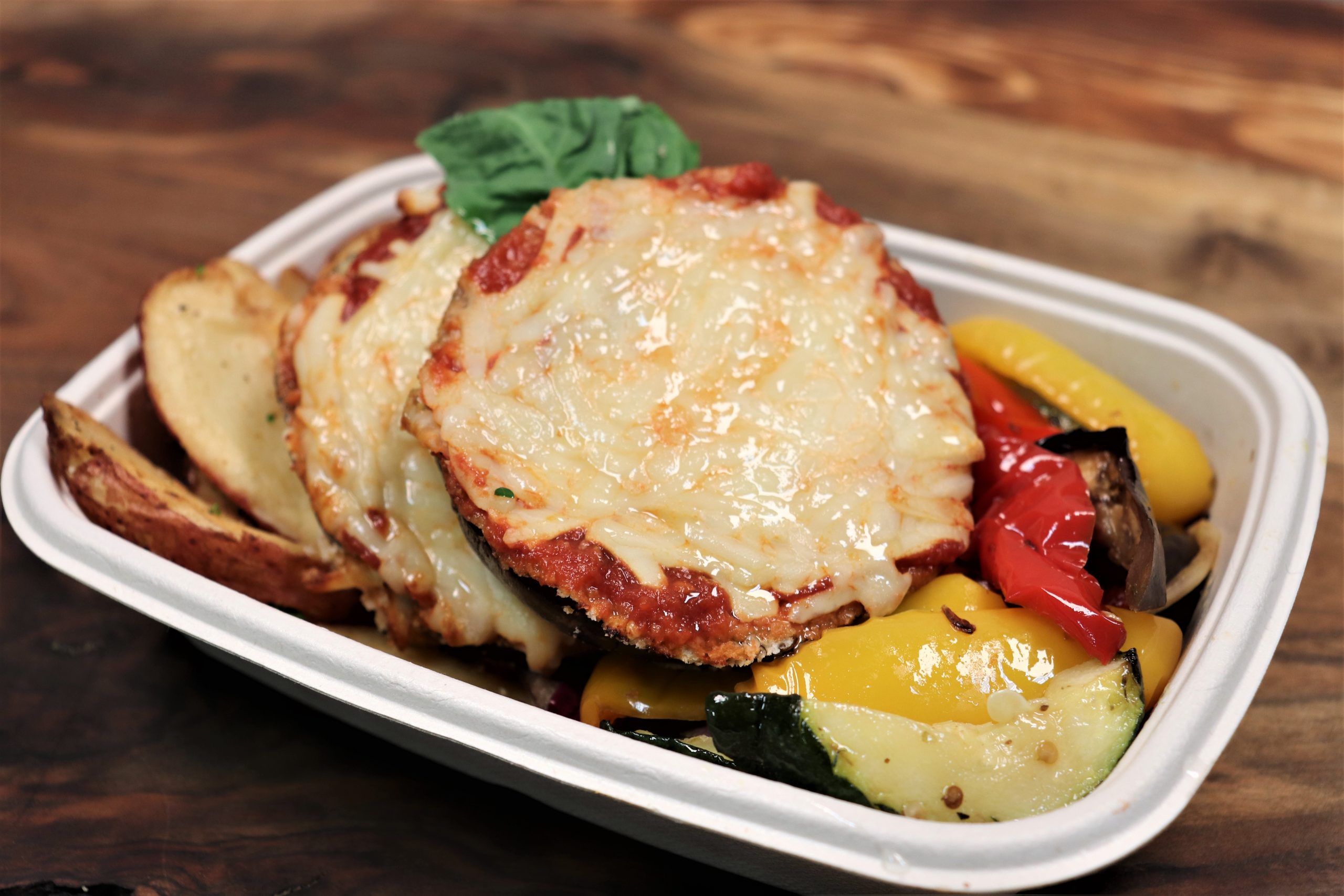 Eggplant Parmesan with roasted mini potato, grill vegetables. Packed individually in a recyclable container that can be heated in the microwave.