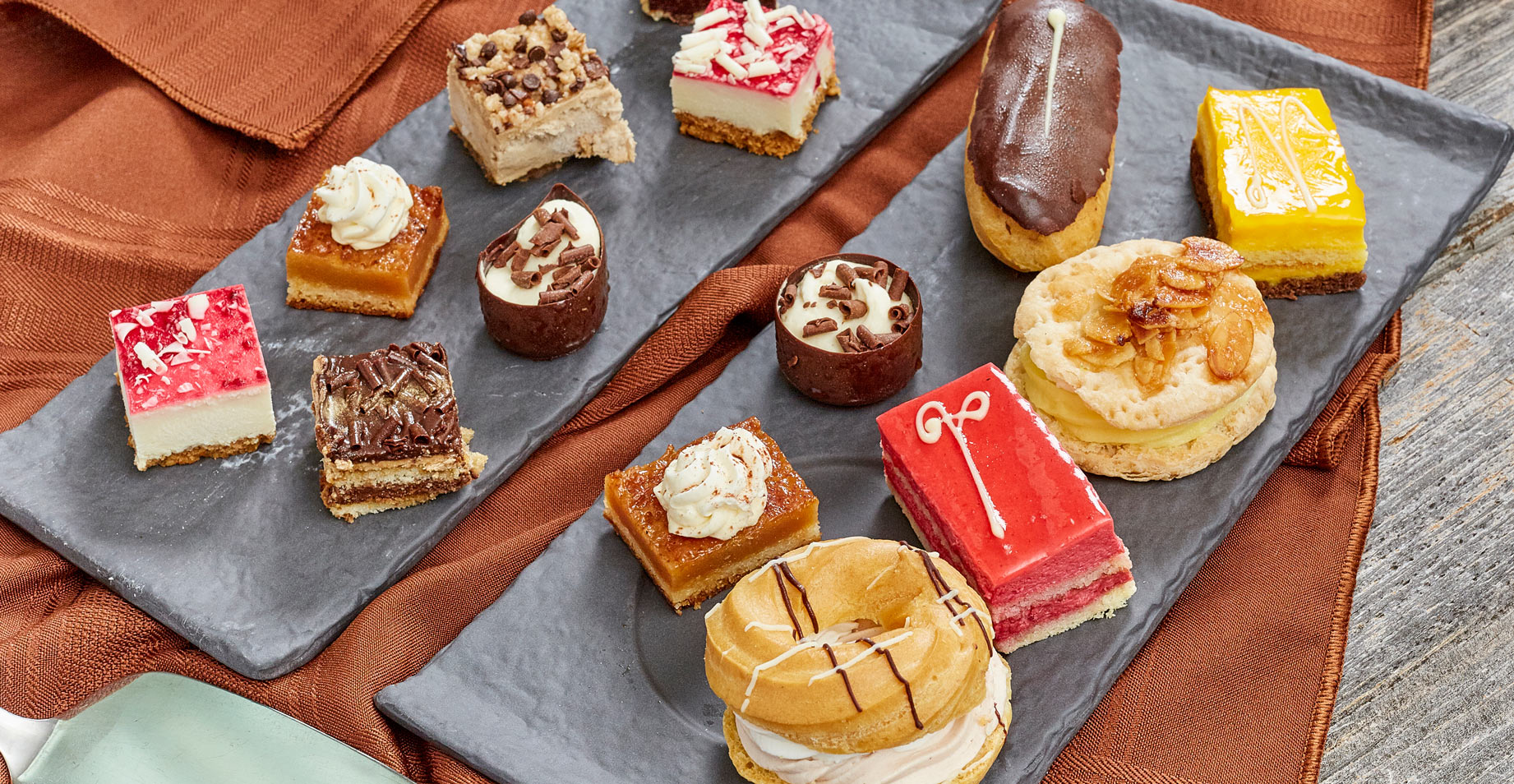 An assortment of individual petit fours, mini cupcakes, and Italian pastries. Pastry assortment may vary.