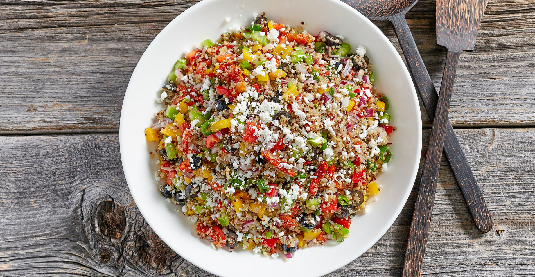 Quinoa, feta, bell peppers, scallions, Kalamata olives, sundried tomato vinaigrette.