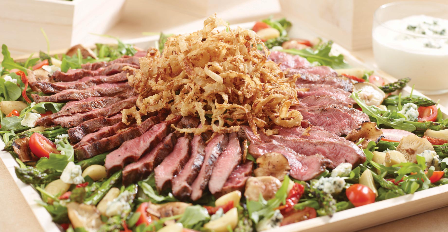 Grilled tender beef striploin on a bed of arugula with crispy onions, cherry tomatoes, roasted garlic, sundried tomatoes and gorgonzola. Served with blue cheese dressing. Served with a basket of freshly baked bread with butter and your choice of one salad bar side.