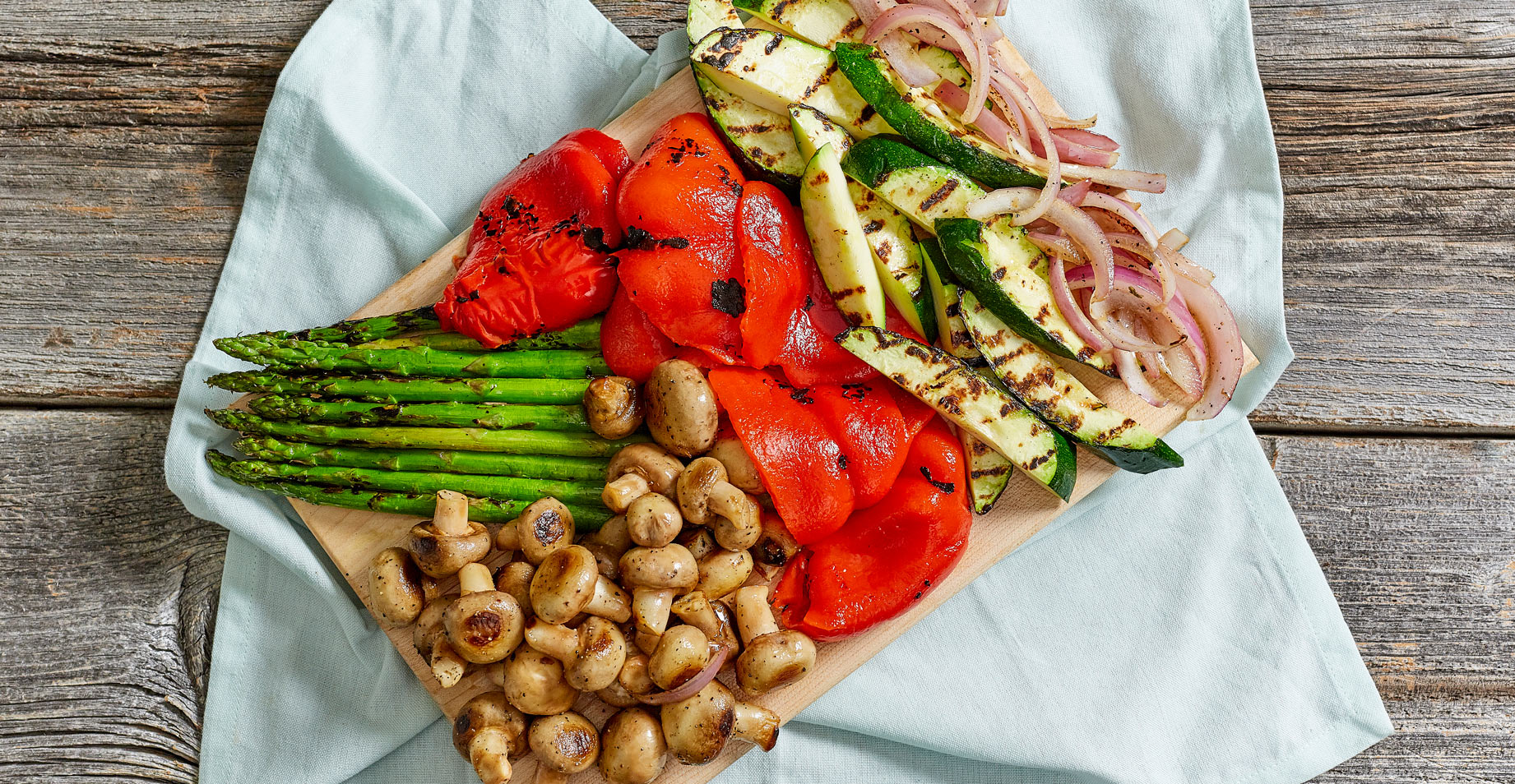 Includes zucchini, asparagus, mushrooms and roasted peppers – grilled with olive oil, sea salt and pepper. Arranged with cloves of roasted garlic and sundried tomatoes.