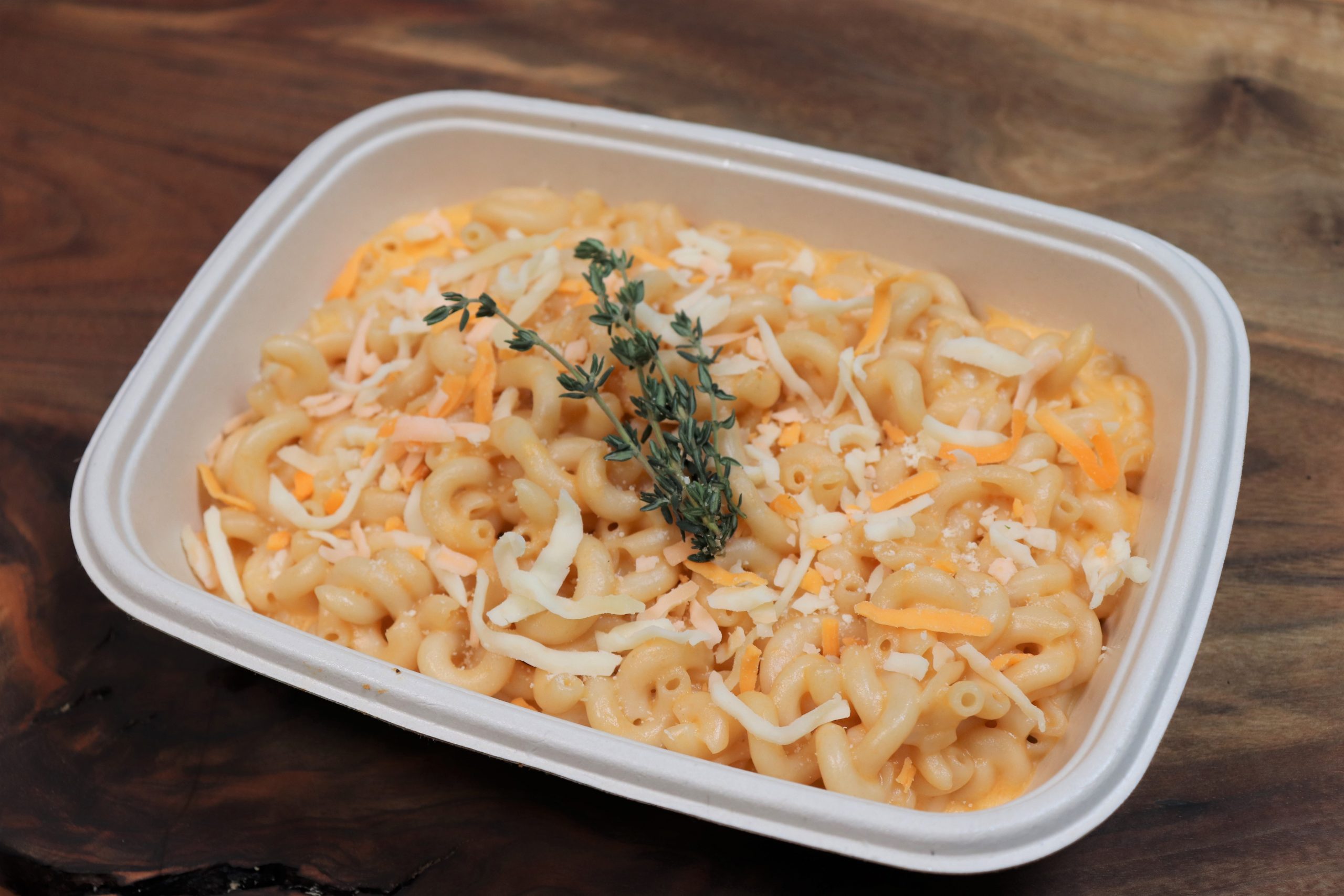 Mac & cheese; gluten-free. Packed individually in a recyclable container that can be heated in the microwave.