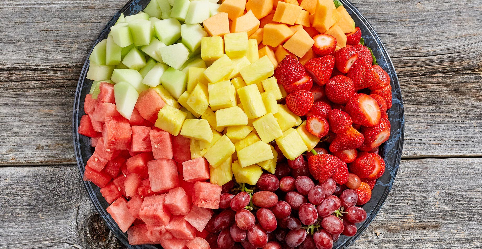 An assortment of freshly cut fruit including melons, strawberries, grapes, pineapple, mangoes and other seasonal fruit.