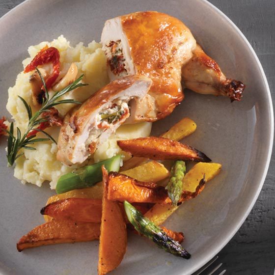Chicken stuffed with goat cheese, spinach, and sundried tomatoes. Delivered cold in foil pans; cooked and ready for reheating.