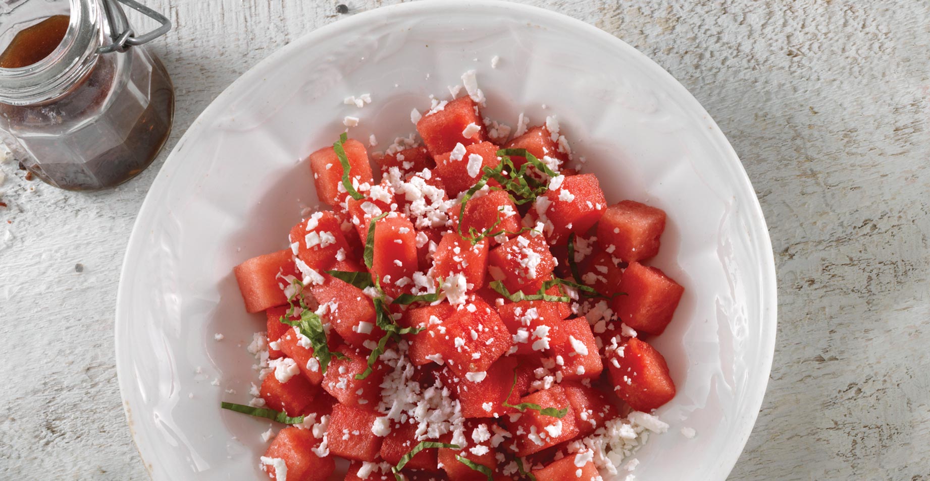 Watermelon, fresh basil, feta cheese, fresh lime juice and balsamic reduction.